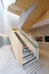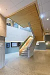 – Vi har tenkt på rommet som et daglig-rom og møtested, der man også bare kan passere gjennom. I trapperommet har vi ønsket å fremheve trappen som transportåre, fremfor heisen. Gjennom utformingen forsøker vi å oppfordre til bruken av trappen. Den er lett tilgjengelig og er det første man ser når man kommer inn døren. Betongtrappen krager ut fra en sentral skive for å bevare åpenheten, og er nøye møblert med kledning og rekkverk av tre. Trappen skal være førstevalget, sier Gjertsen.