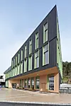 Tilbygget er avlagt og har to spisser, formen er tilpasset tomten. Bærende konstruksjon består av stålsøyler og bubbledeck, med stedstøpt kjerne. Taket er flatt, isolert og tekket med ekstra solid folie. Det ligger et fordrøyningsbasseng på taket. Fasadene har trepanel som er karbonisert etter en japansk byggeskikk, men produsert i Norge. Vinduene er i mange ulike størrelser og med grønne vindusomramminger. Ved hovedinngangen er det benyttet lyst trepanel.