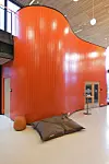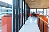 – Som skolebygg er det viktig å bruke robuste materialer som tåler hard påkjenning. Samtidig har det vært viktig at bygget ikke får er institusjonspreg. Fendring i korridor er utført med stående spiler på en side og sementbaserte plater på andre. Spilene vil også fungere som ledelinje, derfor finner vi disse bare på en side. Musikkrommet som er organisk formet og skiller seg ut fra resten av bygget i form har også fått en farge som skiller seg ut som et gjenkjennelsestegn, sier Tjørhom.