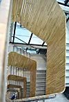 – Det har vært sentralt å legge til rette for gode arbeidsplasser, med sterkt fokus på å få dagslys til disse. I prinsippet er det en liten landsby, med gater og stor variasjon, der man kan møtes på torget i lunsjen. Vi har også vært veldig opptatt av plasseringen av hovedtrappen, den skulle ligge sentralt i bygget og innby til at de som jobber her skal kunne møtes og bevege seg, sier han. Blant andre elementer peker Bertelsen på mye bruk av eksponert betong både i vegger og himlinger, som i tillegg til at det gir et spennende visuelt inntrykk også har en annen effekt.