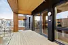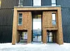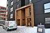 – Det ble også lagt mye arbeid i utformingen av inngangspartiet. Maskinparken TRE ligger jo slik til at det blir en slags inngangsportal til hele området fra Ladesida, og vi forsøkte å skape et signalbygg. Siden blokka er så høy som åtte etasjer ønsket vi å gi inngangspartiet et luftig inntrykk som harmonerer med høyden på bygget. I plan 1 er det trukket inn et område slik at vi får tak over inngangsportalen, og portalen strekker seg opp i andreetasjen. Hovedvolumet har fått en mørkbeiset stående kledning, mens på tilleggsvolumene som inngangsportalen og losjeboksene er det valgt varmebehandlet furu. Mot sør har man valgt franske balkonger. For hele bygget gjelder at man har valgt materialer som samspiller med de to andre blokkene i prosjektet, og også mot den øvrige bygningsmassen som er kommer og kommer i området, sier Aune.