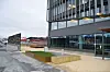 Inngangspartiet på den siden av MAX-bygget som vender mot Tempeveien, er nytt. Både denne og motsatt side av bygget er åpnet opp med nye, store vindusflater som slipper inn mer dagslys. Næringsareal som er tiltenkt flere mindre butikker, står ledig i første etasje.