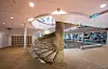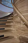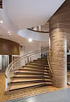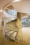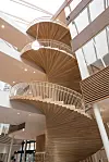 Et blikkfang som vekker umiddelbar interesse er den vertikale kommunikasjonsåren mellom etasjene i atriet. En vindeltrapp i eik bidrar sterkt til CO2-reduskjonen, men befester samtidig inntrykket av gode miljøvalg. Vindeltrappa er designet og montert av arkitekt Trond Meyer i Risa Meyer, som selv har vært elev på skolen.