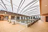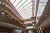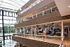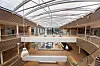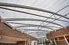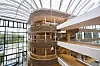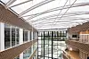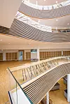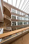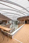 Interiøret preges av en utstrakt bruk av treverk – eikespiler i dekkeforkanter, eikeparkett, en vindeltrapp og paneler i eikefiner − i tillegg til hvite vegger og overflater. Taket mellom de to volumene bidrar også med mye dagslys inn i interiøret. Det er et oppblåst taksystem på 540 kvadratmeter i stål og med en duk laget av EFTE. Det har en vekt på kun en prosent av glass, men med et svært godt lysgjennomslipp og gunstige akustiske egenskaper