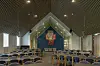 Taket i kirkesalen er av fagverkdragere med q-dekke. Alt treverk innendørs er stort sett i eik, og mye av innredningen er spesialbygget av Bico.
