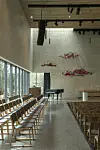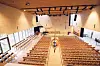 Kirkesalen har fått et avansert mediesystem med lyd og bilde. Er det noe som er vanskelig å kombinere, er det store, flate vegger og god akustikk.