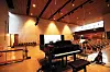 Løsningen har vært spilehimling, knekte glassflater og egne lyddempende materialer, samt gardiner.