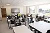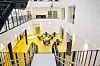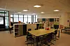 Skolens samlingssal og allrom er utformet som et stort amfirom som går fra plan 1 og 2 tilpasset nivåforskjellen på tomten. Store glassfelt åpner opp til skogen mot nord.