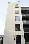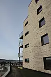 Bygget som er satt opp har en blanding av tegl, panel og stopuss i fasaden. Balkonger og svalganger er av prefabrikkerte elementer med glassrekkverk og søyler, hengt på kniver utenfor teglfasaden.