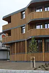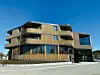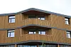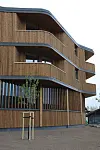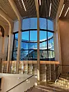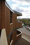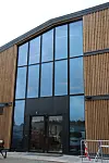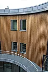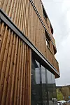 Fasaden består av vedlikeholdsfrie treløsninger og glass. Vinduene i seg selv er spesielle, og består av sekslags isolerglass, som totalt omfatter 900 kvadratmeter.