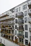 Inn mot gårdsplassen er ytterveggselementene levert ferdig med vinduer og panel, mens fasadene som retter seg ut mot veien og byggene rundt er bygget med ferdige elementer med vindu, men uten kledning. Her har Peab murt igjen fasaden med teglstein etter montering.