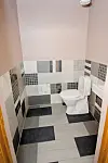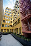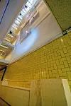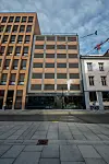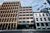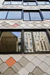 Den gamle fasaden ut mot Kristian Augusts gate er rehabilitert, og det samme er murpussfasaden mot bakgården. Den gamle innkjøringen til bakgården er nå resepsjon, komplett med eksisterende flislagte vegger og søyler. De nye slipte betonggulvene er levert med resirkulert glass i tilslaget, så selv der man har nye materialer i prosjektet, er ombruk fortsatt i sentrum.