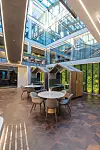 Slitne kontorlokaler har blitt oppgradert og åpnet opp til moderne standard, og det tidligere utvendige atriet har fått et nytt glasstak og blitt et naturlig midtpunkt i fornyede Legenes hus.