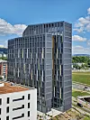 − Elementfasaden er i en mørk antrasittgrå utførelse, men med store felt av gylne plater som gir en funklende arkitektur. Finner i fasaden stikker ut og gir spennende skyggevirkninger, mens splitten i volumene understrekes av et gyllent metallgitter som løsriver volumene fra hverandre. Den markante takformen avrunder bygget mot himmelen, forklarer Lund.