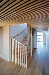 I fellesarealene skaper den plasstøpte råbetongen et moderne, men tidløst uttrykk sammen med eik i både gulv, trapp, vegger og himlinger, og blant de små detaljene er for eksempel franske balkonger i leilighetene og dørmatter nedfelt i gulvet foran hver leilighetsdør.