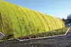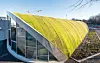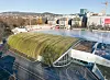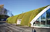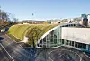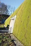 I kravspekken fra KID var det stilt krav om grønne takflater, både for naturlig fordrøyning og som et bidrag til ytterligere innlemming i landskapet. De to sidebygningenes flate tak er kledd med sedum. Men det buede halltaket på 3.500 kvadratmeter har opptil 88 graders helling. Det er ikke optimalt for at sedum kan trives og vokse. Løsningen ble å teste ut en løsning med mose – dyrket på resirkulerte tekstiler. En prøve av taktekkingsduken ble sendt til en fabrikant i Tyskland, og hengt opp på en vertikal vegg. Flere limtyper ble prøvd ut for å teste ut limeevnen mellom duken og den resirkulerte tekstilen.