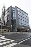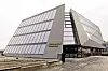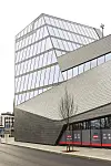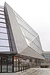Fasadene har mørke, rektangulære skiferheller og glass som står i mange ulike vinkler. Dette gir bygget et flott og særpreget utseende.