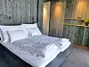 Hvert rom har limtrepanel av furu fra nærliggende Norsk Limtre som holder til i Mosvik. Halvparten av rommene har lys furupanel, og den andre halvparten har mørk. Det samme gjelder baderommene som er plassbygd av snekkere og murere fra Hellvikhus.