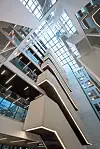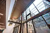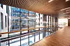 – Men det er også en glassgård i selve bygget, slik at vi har dagslysgjennomgang fra to sider. Man kan se tvers gjennom bygget, noe som gir tilfredsstillende arbeidsplasser. Fylkesmannen ville gjerne ha noen sosiale soner. Det er bakgrunnen for at vi har bruer med tekjøkken i tilknytning til hovedtrappen for hver etasje. De er sosiale soner man må passere før man kommer i de rene arbeidssonene, forklarer Bernhardt. I tillegg er det en utstrakt bruk av glass i kontorskillervegger og i kontorene.