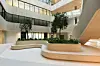 Kronstad plass flyter formmessig og materialmessig inn i nybygget ved bruk av gulv i grå terrazzo. Et mykt formet indre atrium med bruk av trefinér i vegger og himlinger gir bygget en spesiell varm karakter. Det høye rommet med trær og grønne vekster gir identitet og kvalitet til læringsarenaen til glede for ansatte og studenter.