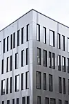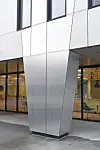 Fasadens hovedmateriale er børstet og natureloksert aluminium, med kontrastfelt i ubørstet natureloksert aluminium. Med ulike glansgrader reflekteres himmelen og omgivelsene, og gjenspeiler skiftende værforhold og årstider. Innslagene av kontrastfelt, samt vinduenes ulike bredde og plassering, gjør at man når man beveger seg rundt bygget, opplever et spill i fasaden.