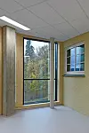 – Vi diskuterte og vurderte ulike former for murpuss eller tegl. Valget falt på en helt ny type teglprodukt som kalles skjermtegl, dette minner mer om takstein enn om vanlig teglstein. Den grønne fargen som blir brukt i glassfasade og vinduer er en liknende farge som ofte har blitt brukt på detaljer på murhus fra samme tidsrom som det gamle bygget. Inne i nybygget er det møbelplater av finer på veggene. I skoler er det mye slitasje, trevegger er mer robuste enn tradisjonell gips. Finerveggene gir en lun atmosfære. Det som kanskje er utfordringen med fineren er alt spillet i platene, vi har derfor valgt få andre farger. Alle gulvene er lys grå vinyl eller terrasso. Inne i nybygget er den gule fasaden på det gamle bygget eksponert flere steder, sammen med fineren er det et gyllent miljø. Derfor ble det valgt gule og bronsefargede detaljer, sier Haraldsrud.