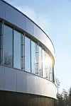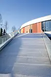 Opp fra det sirkelformede taket stikker det opp et rektangulært oppbygg, som inneholder stupedelen i anlegget. – I hjørnet treffer oppbygget det nedenforliggende taket som går i en bue. I alle disse overgangene med utvendige og innvendige vinkler, overganger på buer og flatt tak til vegg, har det vært utfordringer å prosjektere og å finne gode løsninger for å oppnå kravene til tetthet, forklarer Gaard.
