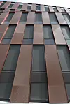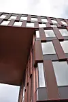Bygget har fått en kobberbrun farge, og den varme fargepaletten går igjen innvendig. Veggene er blant annet kledd i finert bjørk fra Sibir.
