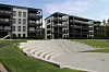 Det er imidlertid ikke leilighetene man først legger merke til ved Grua Torg-prosjektet. I forkant av leilighetsblokkene er det nemlig bygget et utomhusanlegg med et amfi, som vil fungere som møteplass for Grua-samfunnet.