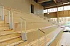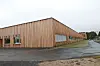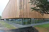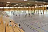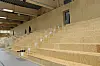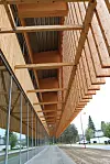 Det første man legger merke til med vinnerprosjektet er valget av store glassflater i idrettshallen og ikke minst bruken av kraftige trespiler.