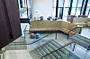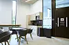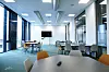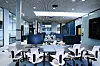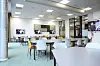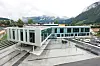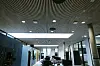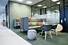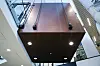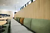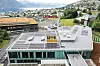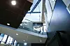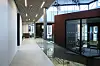 En iøynefallende detalj er to kubeformede grupperom som henger fra taket i fellesarealet i midten. Rommene henger i stålstag. Også en gangbru i betong henger fra taket på samme måte.