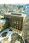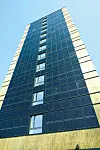I tillegg til fjernvarme er det på den sørvestre gavlveggen av tårnet montert et felt på 410 kvadratmeter med solceller. – Som arkitekt er det veldig fint å kunne bidra med egen produksjon av energi. For å få det til å funke arkitektonisk, ligger solcellene som et avgrenset felt omrammet av trekledningen, og blir som en naturlig del av bygget, forteller Alfarnes.
