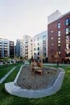 De 227 leilighetene varierer i størrelse fra cirka 41 til 130 kvadratmeter. De tre byggene danner et eget kvartal med et åpent gårdsrom i midten. Trinnet er tilpasset ytterbegrensningene på tomta.