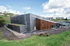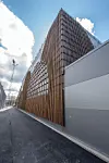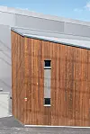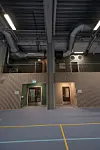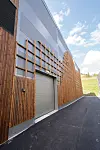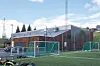 Bygget har ytre bærevegger i stål, men er også forskjønnet med ytre trekledning og et trespilemotiv som viser til ballidrett på fasaden som vender seg mot kunstgressbanen like ved. På taket er det lagt sedum, og dette gjør også at byggets femte fasade opp mot T-banesporet og publikum i området blir fin å se på.