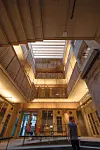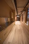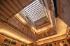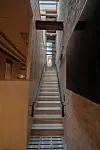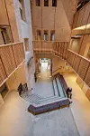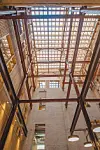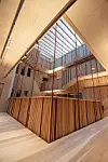 I tillegg til at gamle trebjelker er bevart og trukket frem i lyset i det rehabiliterte bygget, er det også utstrakt bruk av nytt treverk inne i atriet som åpner hele bygget inn mot en åpen kjerne med sollys filtrert ned gjennom bjelkene i taket.