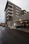 I etasjen på bakkeplan som vender mot kjøpesenteret, har man bygget parkeringsanlegg til kjøpesenteret med plass til 64 biler.