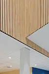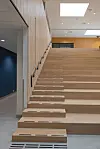 – Siden dette er en barneskole har vi lagt bygget slik i terrenget at det virker nedskalert. Hele første etasje har en åpen og innbydende fasade med glassplater. I andre og tredje etasje er det korte stående lengder av royalimpregnert trekledning som en slags stilisert vestlandsk kledning. Dette er en fin måte å få fram en nedskalert struktur med skyggespill i fasaden, og dette igjen understreket av de varierte vindustørrelsene, sier Højgaard Nielsen.