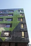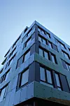 Det mest iøynefallende med prosjektet er den spesielle glassfasaden som omkranser de to blokkene.