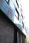 – Det er ingen utenpåhengte elementer som stikker ut forbi den stramme formen. Bygningen møter gaten med en urban fasade som er litt inntrukket i forhold til volumet over. Det er viktig for oss å etablere en god forbindelse mellom gaten og bygningene. Materialet mot gaten er tegl med åpninger i full høyde med detaljer i metall, skriver arkitekt Atrec i sin beskrivelse av prosjektet.