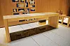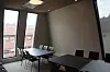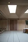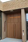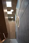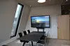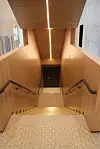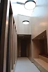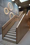 Innvending er bygget i stor del kledd med eikepanel, og noen steder er det eksponert betong.