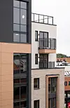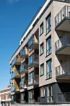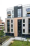 Fasadene på de to byggene er oppdelt av ulike sprang, innhakk, overganger og karnapper rundt enkelte vinduspartier. Det er også brukt flere typer materialer; tegl, pussfasader og Fundermaxplater som ser ut som treverk.