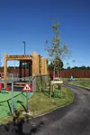Hovedinngangen ligger på forsiden, mens man på baksiden har etablert et omfattende utomhusområde, som totalt er på 3.792 kvadratmeter. De er utformet basert på et konsept om å gjenskape en miniatyr av den lokale geografien i og rundt Kløfta med en «eng» (plen), «skog» (frukttreskog), «motorvei» (sykkelløype) og «jernbane» (tog-lekeapparat).