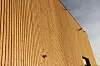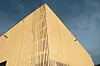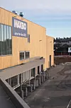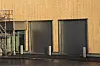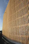 Fasaden har foruten sandwichelementene innslag av malmfuru for at bygget skal fremstå litt mer estetisk enn et vanlig sandwichbygg.