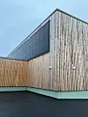 Veggelementene er kledd med trykkimpregnert termofuru. Taket er tekket på ordinert vis med membran, og det er også montert solceller på deler av takkonstruksjonen. Det ble i tillegg gjort avrop på en tilleggsbestilling med montering av solceller på den ene veggen. Solcelleanleggene kan samlet produsere rundt 83.000 kWt i året.