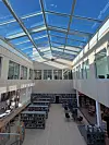 Det er benyttet en lettaksløsning over tredje etasje, for øvrig er det ordinær tekking. Bygget er satt opp som et passivhus, men på grunn av glasstaket har det passivhusstandard.