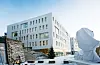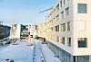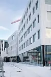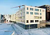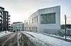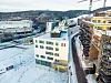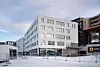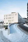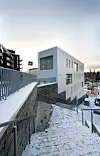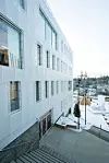 Snøhus 1 og 2 henger sammen i alle etasjer med et mellombygg med glassfasader, der ligger også den felles hovedinngangen.