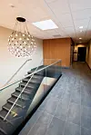 Teknologiselskapet, som også er medeier i bygget, har i tillegg til et påkostet velkomstområde på bakkeplan, fått spesialbygde lokaler for svært nøyaktig laboratoriearbeid.