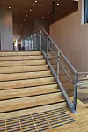 Han sier at det er brukt flere ulike treslag innvendig. En stor del av veggene er kledd med plater i bjørkefiner. Disse er perforert med bitte små hull som ikke er synlige på avstand og som er med på å gi en god akustikk. På størstedelen av gulvene er det brukt eik industriparkett og på noen vegger er det spiler i furu.