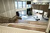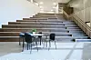 – Når du kommer inn i bygget gjennom hovedinngangen, kommer du til hjerterommet med amfi og inngang til både hall og skole. Vi har egen inngang til andre etasje, slik at de største elevene kan komme til sine klasserom uten å måtte gå hele veien gjennom hovedinngangen i første etasje.