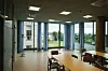 Nybygget er bygget sammen med et eksisterende lab-bygg på baksiden. Det er gangbro mellom byggene med glasstak over. Under glasstaket blir treningssenter.